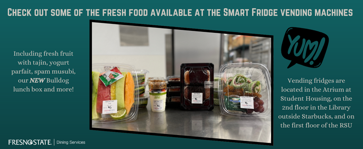 University Dining Services now offers fresh food vending on campus with refrigerated machines located in the Atrium at Student Housing, The RSU first floor and on the second floor of the library. Our machines accept campus card or credit card payments and are stocked with a rotating selection of items like freshly made sandwiches, salads, yogurt parfaits, sushi, fresh fruit and more. Stop by one of our locations and check it out today!