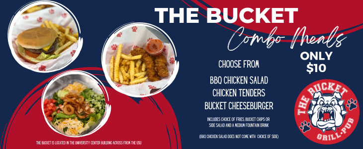 Located inside the University Center Building, The Bucket is the go-to spot for burgers, chicken strips, Me-n-Ed’s pizza and more. Looking for something a little lighter? The Bucket also offers salads and wraps, including vegan, vegetarian and gluten free selections.